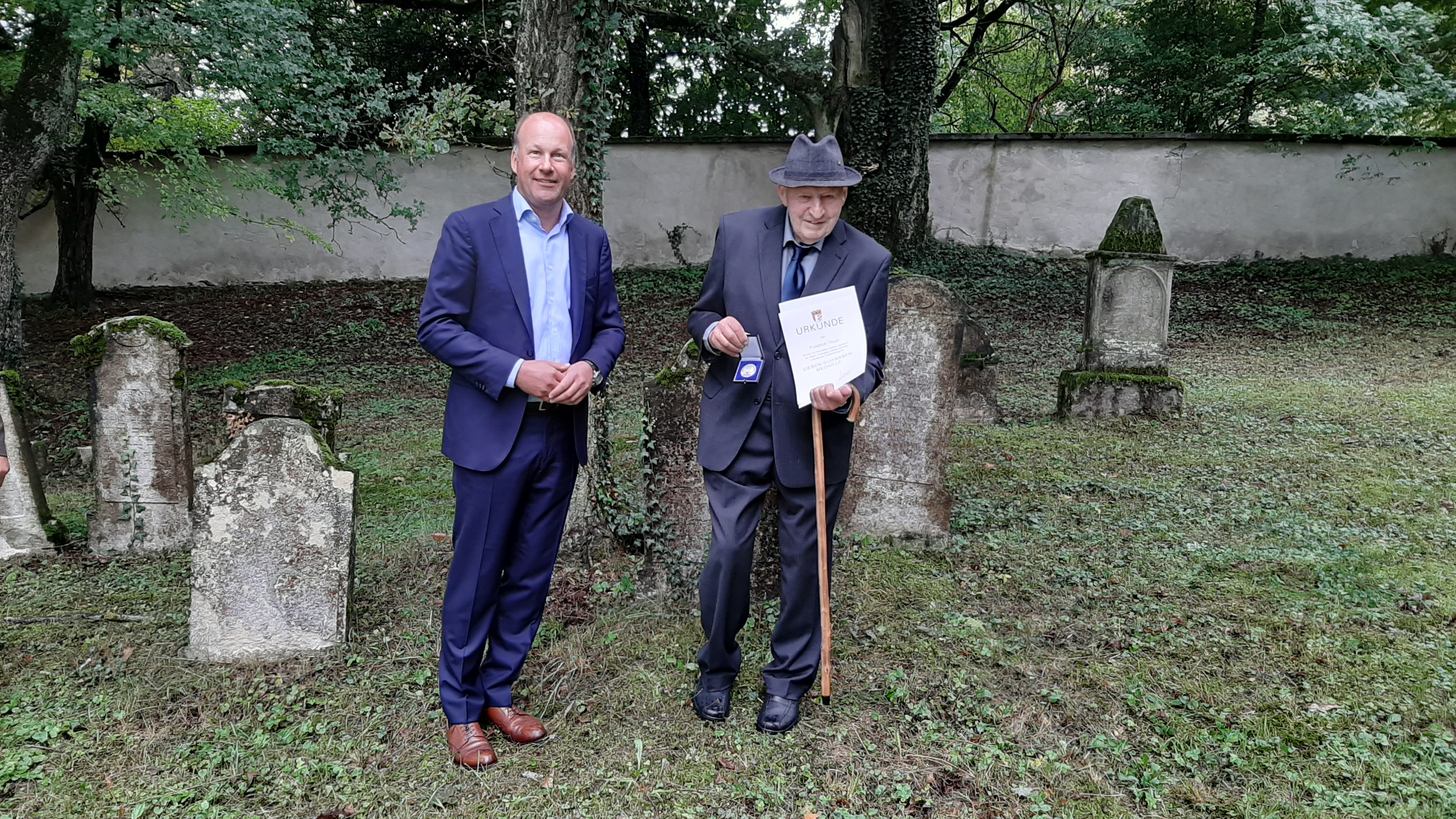 Sieben-Schwaben-Medaille: Bezirkstagspräsident Martin Sailer und Medaillen-Empfänger Friedrich Thum auf dem jüdischen Friedhof in Harburg (Landkreis Donau-Ries)